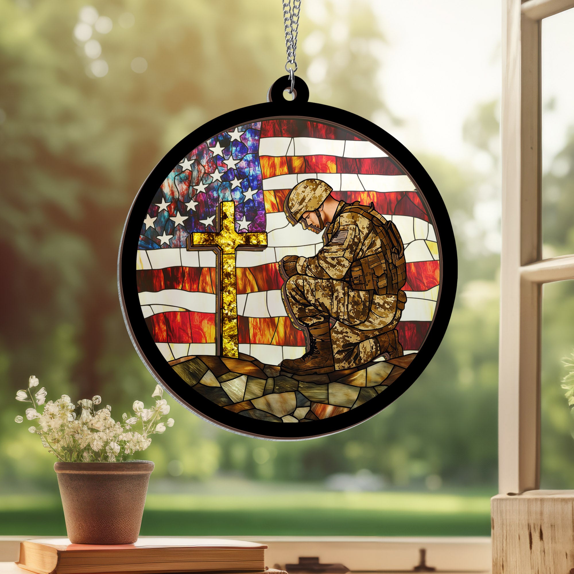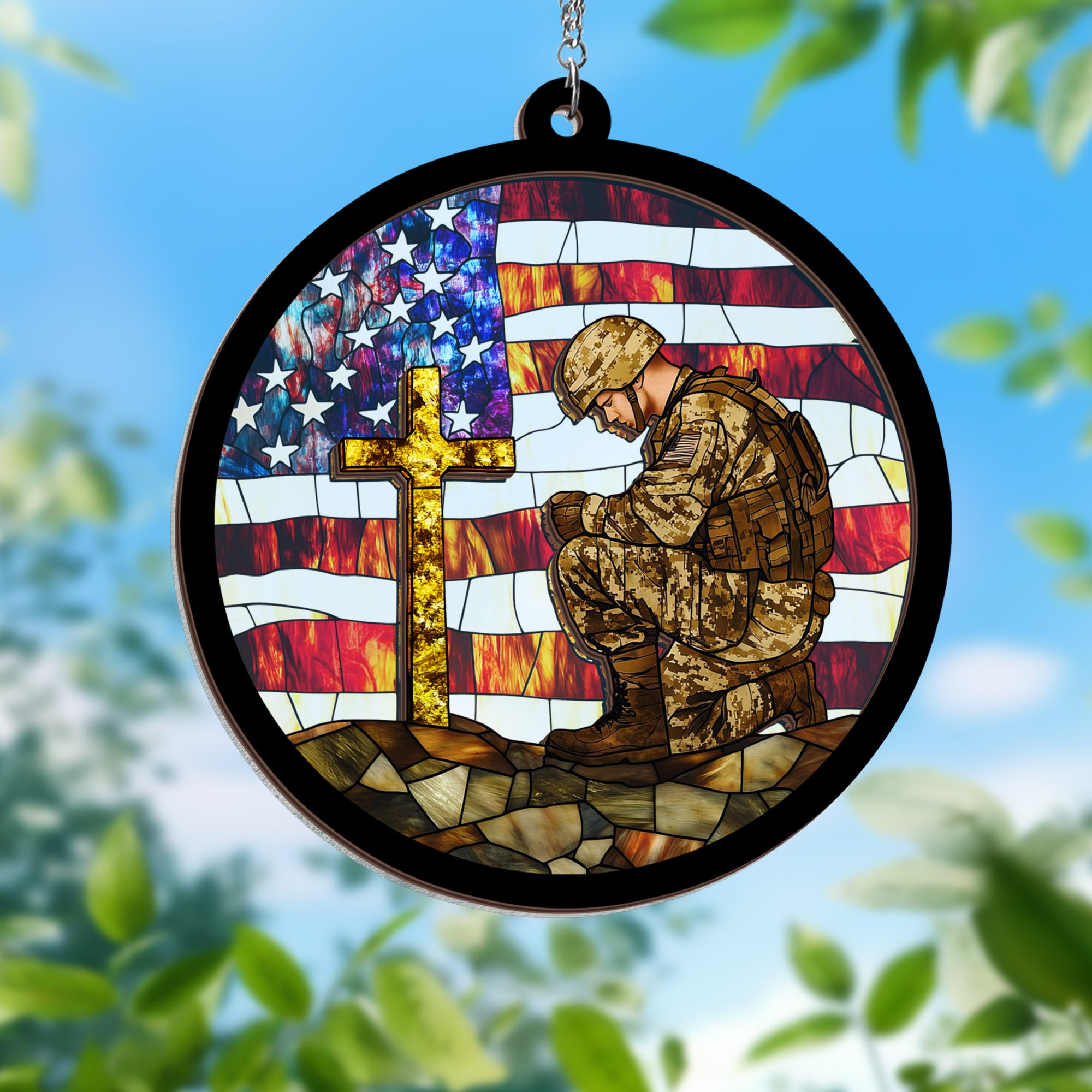 Christmas Ornament, American Flag with Cross Veteran Day 2 Layered Hanging Suncatcher