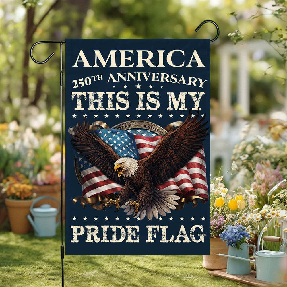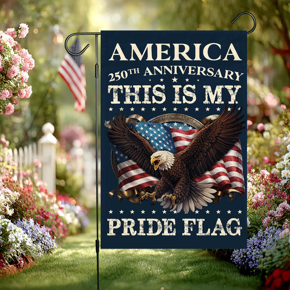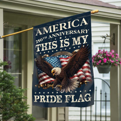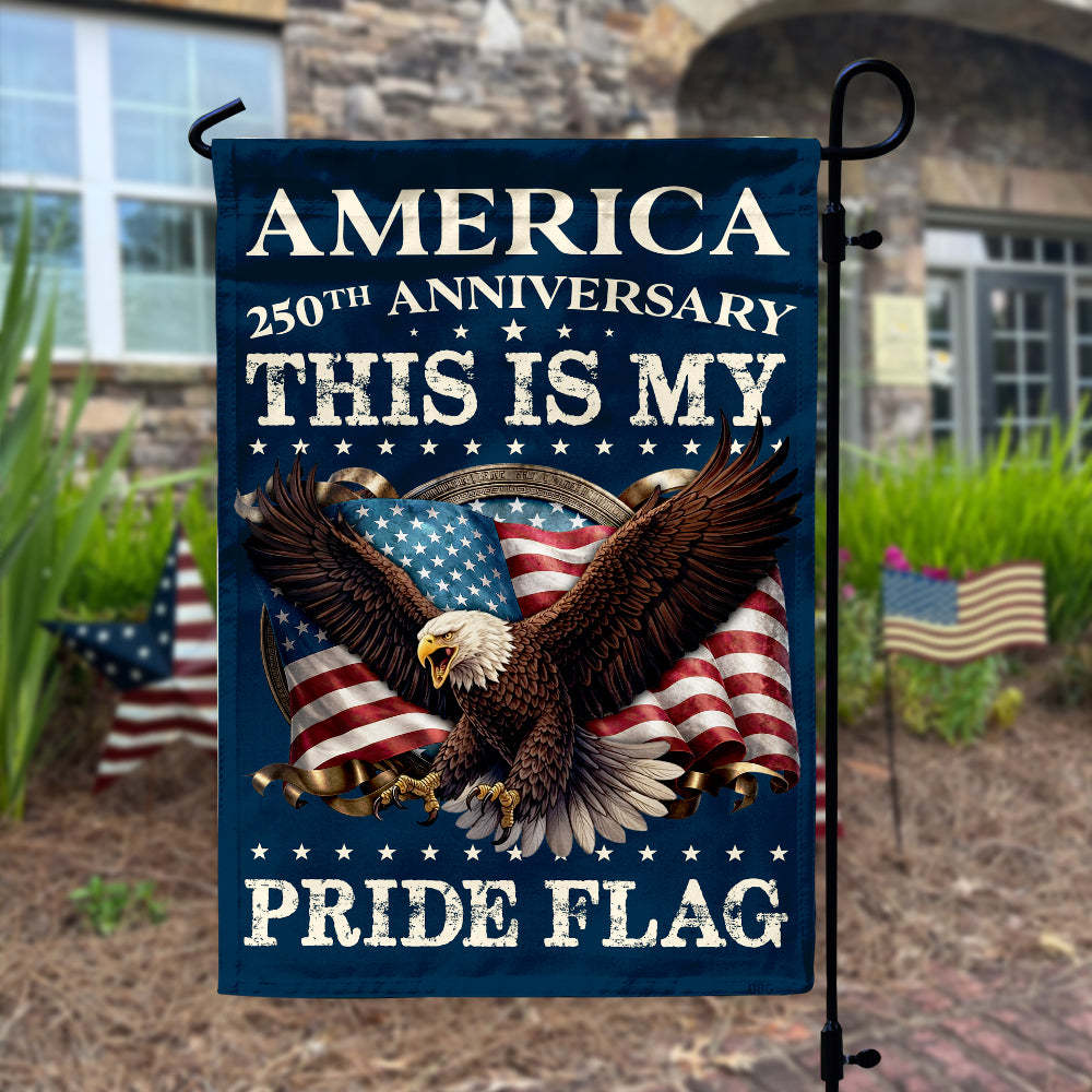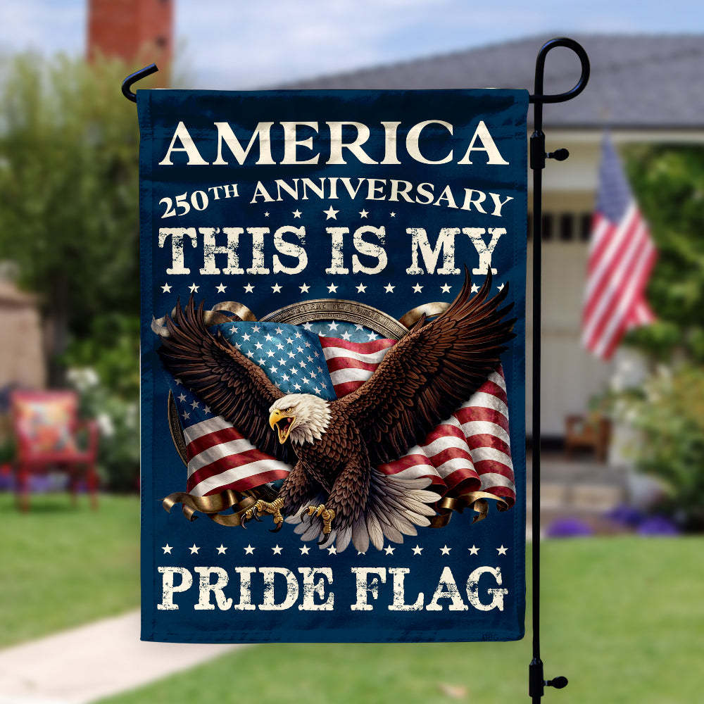 Make a bold statement with the "This Is My Pride Flag" garden flag, crafted specifically to commemorate the America 250th anniversary. Featuring a fierce bald eagle set against a vintage US flag backdrop, this design is the ultimate declaration of American pride, liberty, and the enduring values of the USA constitution.