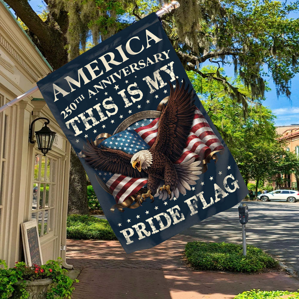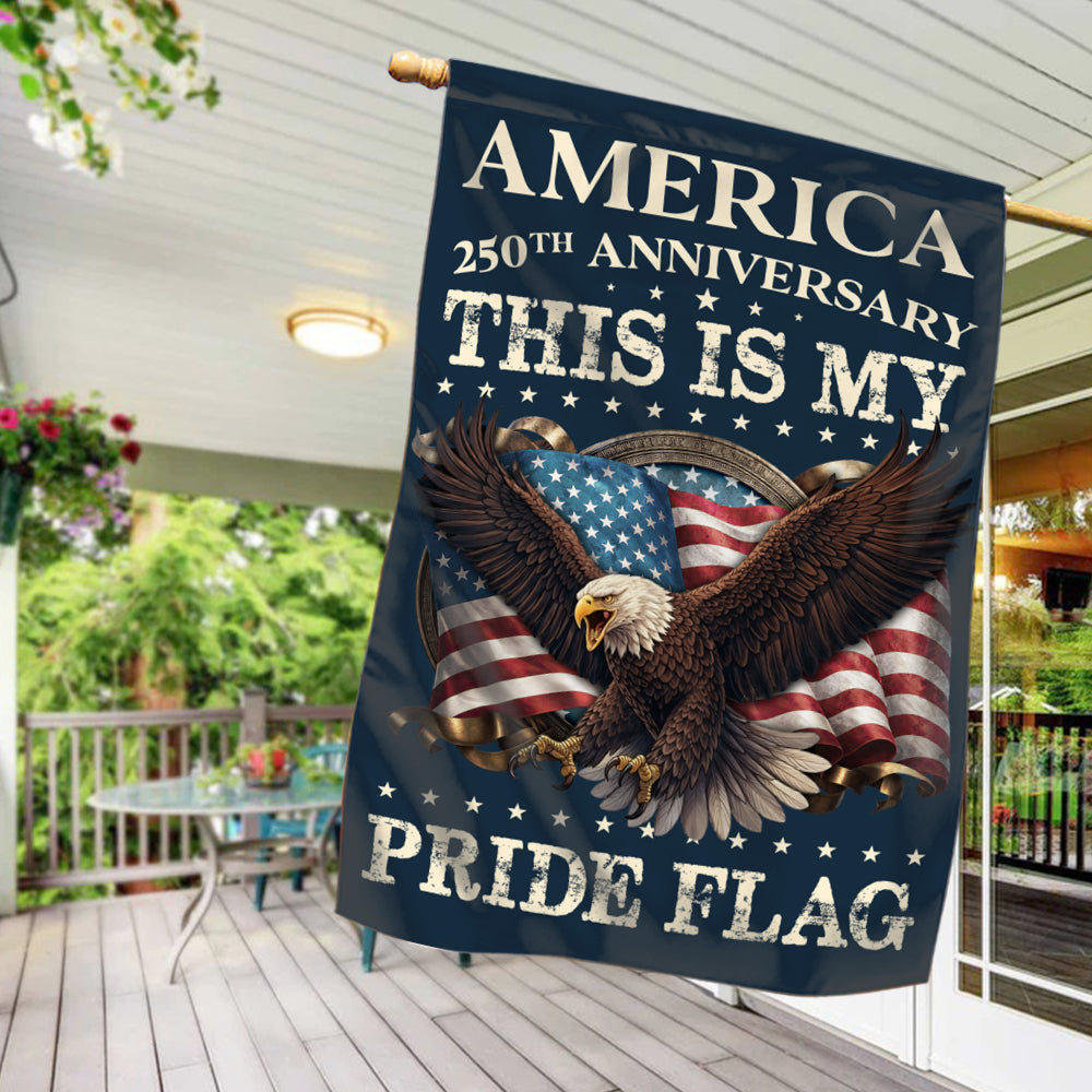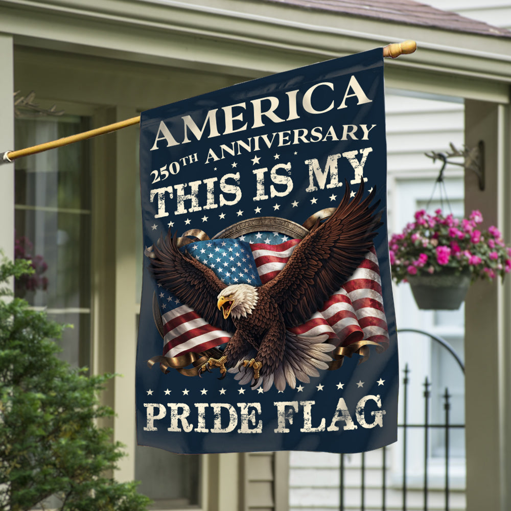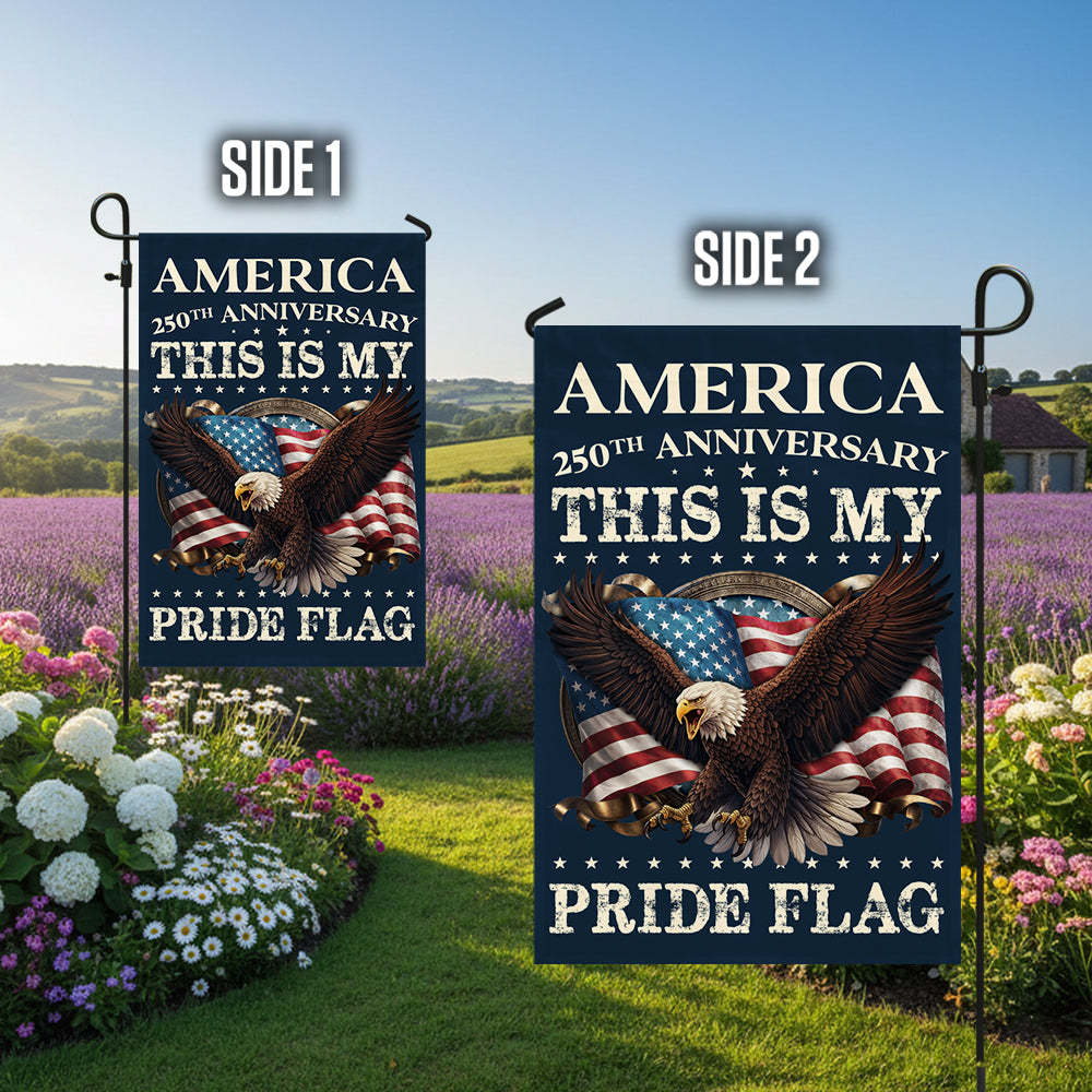 Make a bold statement with the "This Is My Pride Flag" garden flag, crafted specifically to commemorate the America 250th anniversary. Featuring a fierce bald eagle set against a vintage US flag backdrop, this design is the ultimate declaration of American pride, liberty, and the enduring values of the USA constitution.