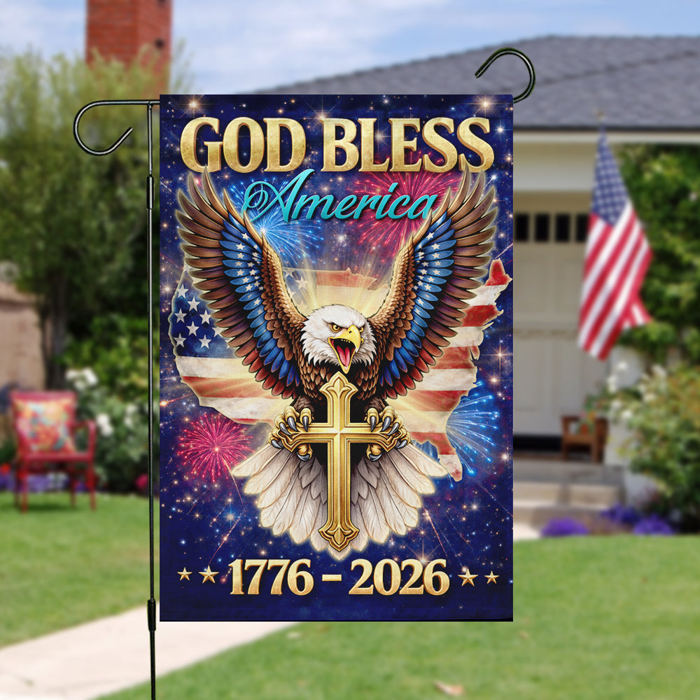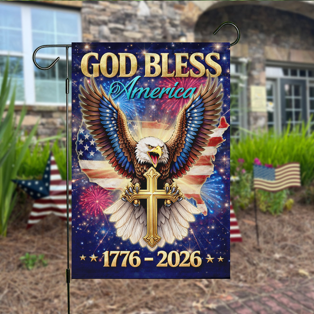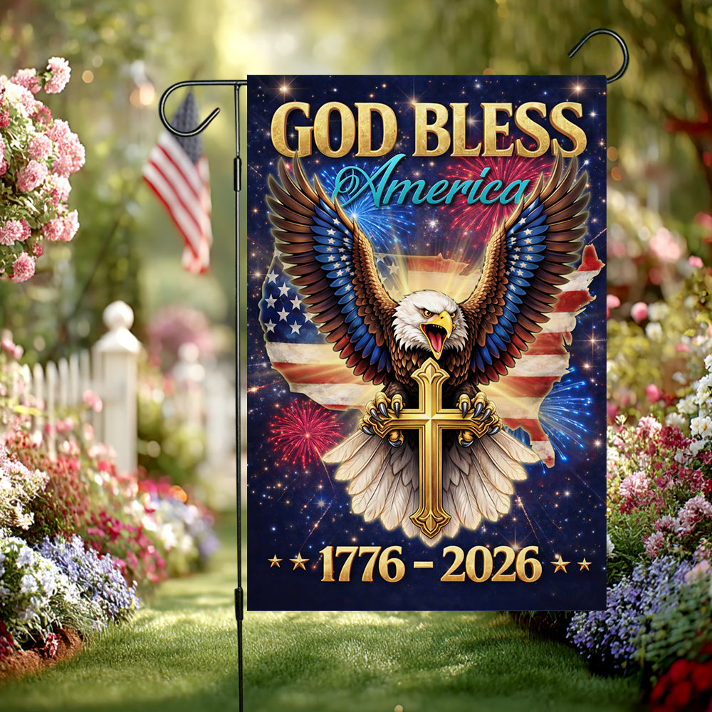 Showcase your unwavering faith and deep American pride with the breathtaking "God Bless America" Garden Flag. Specially designed for the monumental 1776 - 2026 milestone, this stunning piece features a majestic bald eagle clutching a golden cross, set against a patriotic USA map and a vibrant night sky filled with fireworks. It is a powerful declaration of faith, liberty, and the enduring values of the USA constitution that unite "We the people."