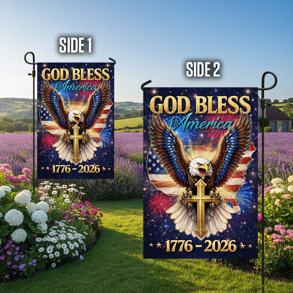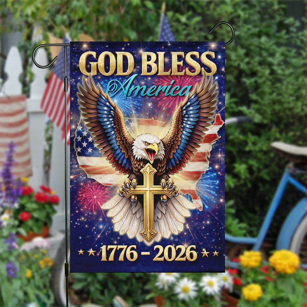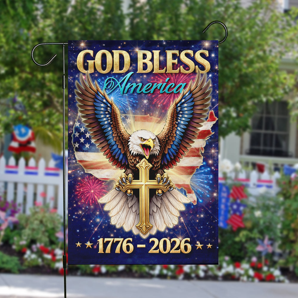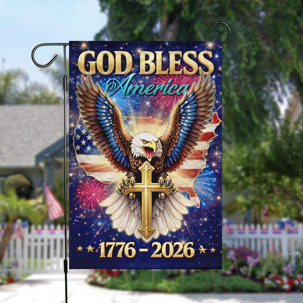 Showcase your unwavering faith and deep American pride with the breathtaking "God Bless America" Garden Flag. Specially designed for the monumental 1776 - 2026 milestone, this stunning piece features a majestic bald eagle clutching a golden cross, set against a patriotic USA map and a vibrant night sky filled with fireworks. It is a powerful declaration of faith, liberty, and the enduring values of the USA constitution that unite "We the people."